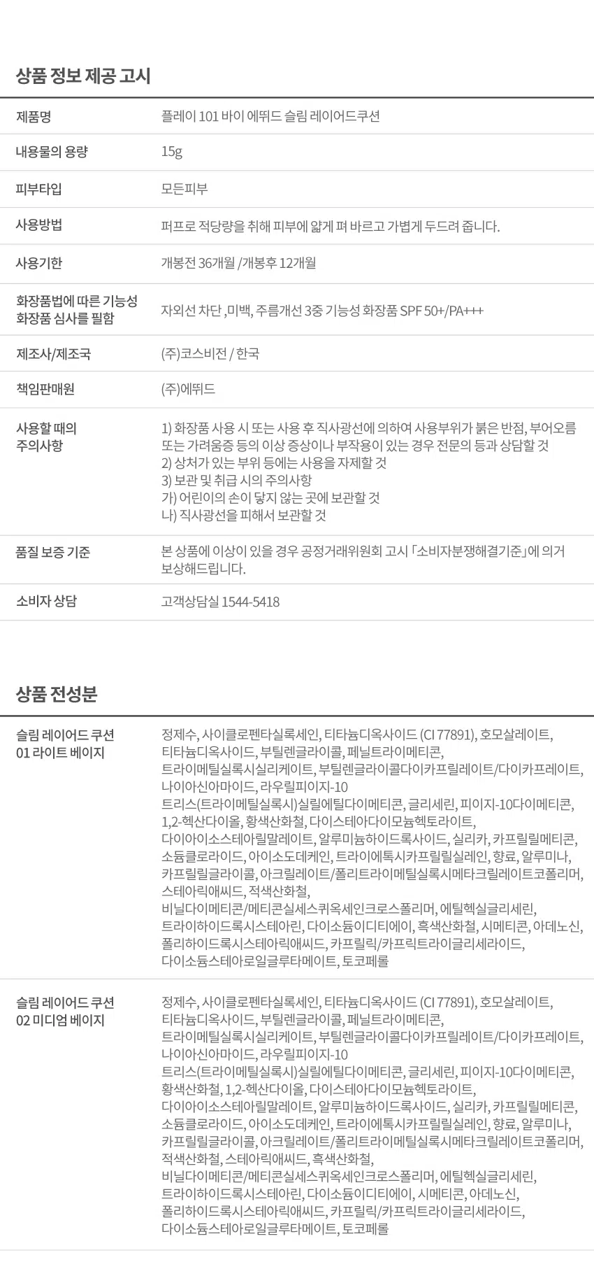[01 라이트 베이지]플레이 101 바이 에뛰드 슬림 레이어드 쿠션 15 g